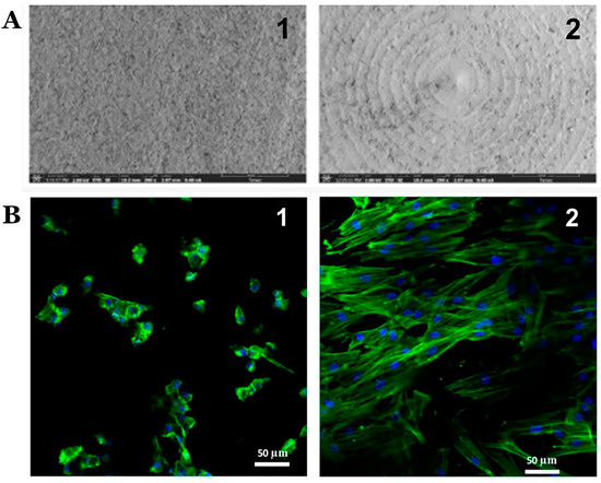 Images of surface structure using scanning electron microscopy (at 200× magnification) of ZLS (A1) and Y-TZP (A2); and confocal microscope images (20×) of fibroblasts on ZLS (B1) and Y-TZP (B2) [100].