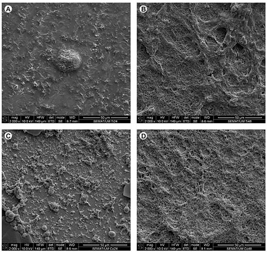 SEM figures received on commercially pure Ti surfaces (A,B) and Cr-Co-Mo alloys (C,D) covered with biofilms after 24 h (A,C) and 48 h (B,D) of growth in a BHI medium supplemented with 5% sucrose. Figures obtained using secondary electrons mode (SE) at 10 kV [139].