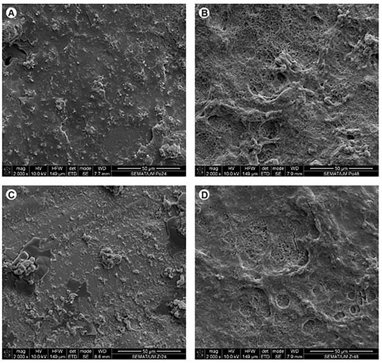 SEM figures received on feldspar-based ceramics (A,C) and Zr (B,D) covered with biofilms after 24 h (A,B) and 48 h (C,D) of growth in a BHI medium supplemented with 5% sucrose. Figures obtained using secondary electrons mode (SE) at 10 kV [139].