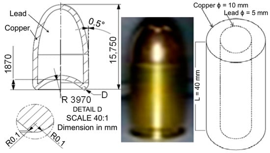 Geometry of bullet head (Left), actual bullet and projectile (Right). Note: the actual bullet dimensions were 9 mm diameter × 19 mm length full metal jacket round-nosed bullet, as specified by the NIJ Standard Type Threat Level IIA (NIJ IIA) [].