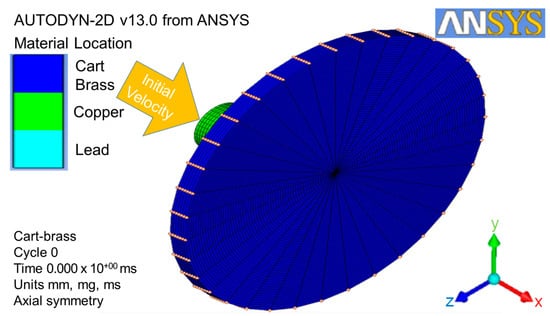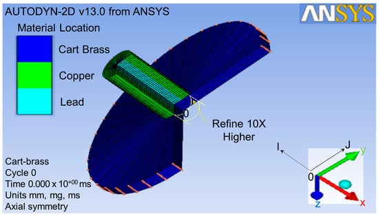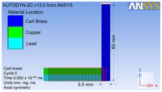 The important properties of material models for three materials, such as cartridge (cart) brass [], lead [], and copper [], were used in the numerical simulation as shown in Table 1. For the other properties of material models, please refer to Table A1 of Appendix A. The material models of Johnson–Cook [], Steinberg–Guinan, and Piecewise–Johnson–Cook for cart brass, lead, and copper, respectively, were selected from the library of Ansys Autodyn non-linear dynamics analysis software (Autodyn, version 13, Canonsburg, WA, USA).