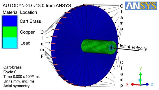 The two-dimensional axial and x-axial symmetries must be predefined in order for the model to convert from two-dimensional geometries to three-dimensional geometries at the x-axial symmetry. The three-dimensional geometries with the respective coordination and dimensions were loaded with the conditions of clamp, gap interaction, and initial velocity (as shown in Figure 5). The whole numerical simulation process can be checked by clicking the viewing plot on the icon bar. Furthermore, the solution controls, such as wrap-up criteria, time-step options, and solver options, were used to gain the higher quality images during the metallic material failure point.