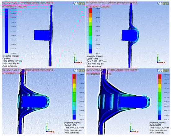 Autodyn with a finite element code using four-nodes 2D asymmetric element in one integration point was used to analyze the simulation tests explicitly. The Lagrange framework model with visco-plasticity and ductile damage computational mode was coupled with non-friction interaction and stiffness-based hourglass control for the element-kill algorithm to minimize the error in the erosion process and maximize the efficiency. In order to simplify these simulation test studies, the ballistic impacts were limited to the perpendicular direction of the target based on the assumption that the maximum impacts occurred []. Therefore, the other impact directions were neglected for these simulation test studies. The simulation tests were run and exhibited at the cycles of 0, 10,415, 21,664, and 38,969 for the times of 0, 0.05, 0.1 and 0.15 ms, respectively (as shown in Figure 6). Various velocities of NIJ IIA were inputted into the simulation tests in order to obtain a ballistic limit velocity (BLV) that just perforated the target (as shown at the bottom right of Figure 6).