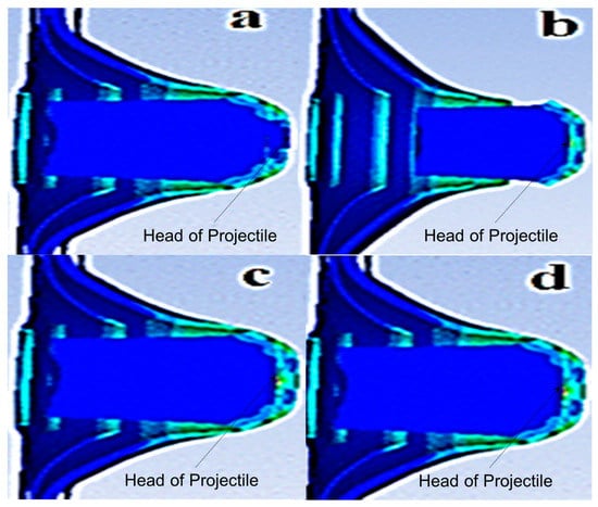 BLV [] was defined as the projectile velocity that penetrated the target with at least 50% reliability or kinetic energy loss []. This was similar to the simulation requirement to determine the BLV as the projectile velocity that perforated the cart brass target plate at the slowest rate (as shown in Figure 7a). The numerical simulation was described by the projectile head impacting target phenomena of BLV, completely perforating velocity, almost perforating velocity, and nearly perforating velocity (as shown in Figure 7a–d, respectively). For the almost and nearly perforating velocity phenomena, the projectile velocity penetrated the target at different depths but was unable to perforate the target.