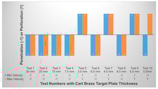 Penetration and perforation of minimum and maximum initial projectile velocities impacted on various cart brass target plate thicknesses.