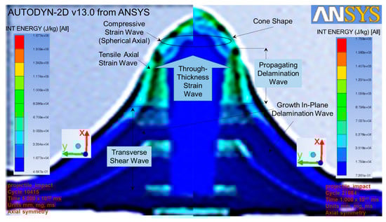 While the projectile impacted the target plate, the tensile and compressive strain waves were developed and reacted [] from the y-axial and spherical x-axial, respectively, as shown at the left of Figure 9. The projectile continued to progress in the x-axial to counter the through-thickness wave in the opposite direction [], resulting in a transverse shear force. This force continued to form a wave to counter the projectile progression, resulting in the growth in-plane delamination wave []. This phenomenon especially occurred at the first few predefined interfaces or the refined zone of the cart brass target plate which was elucidated by selecting the simulation cycles of 10,415 and 21,664 (as shown in Figure 9). This enabled us to have a more insightful evaluation of the fracture mechanism [] related to the delamination growth in the representative volume cell at each material integration point []. The projectile further progressed to form a pyramid shape in the interfaces due to the reaction from the propagating delamination wave, as shown at the top right of Figure 9. All of these reaction waves continued to counter the projectile progression, following with a larger deformation from all interfaces until a cone shape was formed at the back of the target. This was the local punch shear-cone wave that bulged dynamically from the back-face of the target. Lastly, the target failed by the projectile breaking the membrane tensile failure strain.