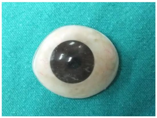 Anophthalmic sockets or loss of an eyeball can be caused by various reasons, mainly due to trauma (46%) and malignant tumor (44%), followed by nonspecific (8%) and congenital (2%) [,]. Among malignant tumors, retinoblastoma and malignant melanoma were the most common pathological diagnoses [,]. The prosthetic rehabilitation of an ophthalmic socket is important, as an eye defect undeniably impacts patient self-esteem and causes esthetic and psychological problems [,]. An ocular prosthesis, or fake eye (Figure 1), generally fabricated from polymethyl methacrylate (PMMA) or acrylic resin, replaces the missing organ and provides esthetics and psychological comfort to the patient. The ocular prosthesis of appropriate contour, size, and color bars patients from being handicapped and allows them to pursue their normal lives [,].