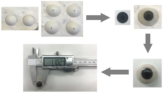 At first, ocular molds were prepared with dental stones. Then, the white acrylic resin was packed and cured, according to the manufacturer’s recommendation. Following curing, the ocular prostheses were trimmed and polished. The center of the ocular prosthesis was marked in each ocular prosthesis. The specific depth portions of acrylic at the center of the white acrylic prosthesis were removed: none for T0, 2 mm for T1, 4 mm for T2, 6 mm for T3, 8 mm for T4, and 10 mm for the T5 group. Then, from a black A4-sized paper, a round iris, with a mean diameter of 10.25 mm (initial size of the iris), was cut and attached to each ocular prosthesis using glue (Figure 3 and Figure 4). The iris is covered with the monopoly (10 parts of monomer: 1 part of polymer) and dried.