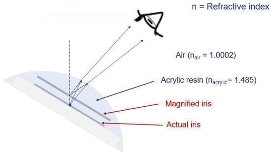 Furthermore, this study provides the information of the final observed diameter of the iris and the magnification of the iris obtained through numerical calculations. Various factors that can affect the magnification of the iris in the ocular prosthesis are the thickness of clear acrylic resin, curvature of clear acrylic resin/shape of the ocular prosthesis, diameter of the iris, and refractive index differences between the clear acrylic resin and air (refractive index of PMMA/acrylic resin is 1.47 [], with 1.0 for air) []. In the human eye, the refractive index of the cornea and overlying tear film are key factors affecting refraction and overall optical properties of the eye, and the normal refractive index of the human cornea is 1.376 (range from 1.335 to 1.4391) []. Similarly, the refractive index of PMMA is 1.47 []. Hence, the refraction of light in clear acrylic resin is comparable to the human cornea. If the ocular prosthesis is made from ceramic materials, the magnification results might have been slightly altered, due to the difference in the refractive index (refractive index of glass-ceramic is 1.55) [].