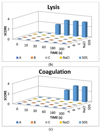 Endpoint score of (a) hemorrhage, (b) lysis, and (c) coagulation.