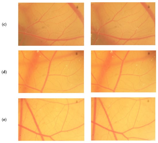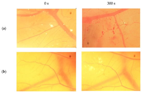The result scores of all samples and reference substances are shown in Figure 3. A significant change happens in the positive control group from 10 s until 300 s. The samples, comparison substances, and negative control did not show a significant change. More complete scoring results for hemorrhage, lysis and coagulation can be seen in Supplementary Materials of Figures S1–S3. Micro images of a blood vessel in the HET-CAM test are shown in Figure 4. Blood vessel damage was seen significantly in the positive control group, while the samples, reference substances, and negative control, did not damage the blood vessel. Detail figures of blood vessel micro images can be seen in Supplementary Materials of Figures S4–S8.
