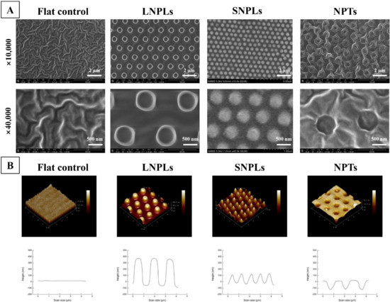 Surface characterization of the nanopatterned and flat substrates. (A) SEM images of the substrate surfaces. (B) AFM images of the substrate surfaces: three dimensional images (upper row) and height profiles (bottom row).