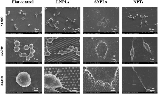 To monitor changes in cell morphology caused by nanopatterned topographies, RAW 264.7 macrophage cells were cultured on nanopatterned or flat PDMS substrates for 24 h. In general, cells exhibited heterogenous morphologies; nevertheless, certain morphologies were more predominant on specific nanopatterned substrates, which were presented in SEM images (Figure 2).