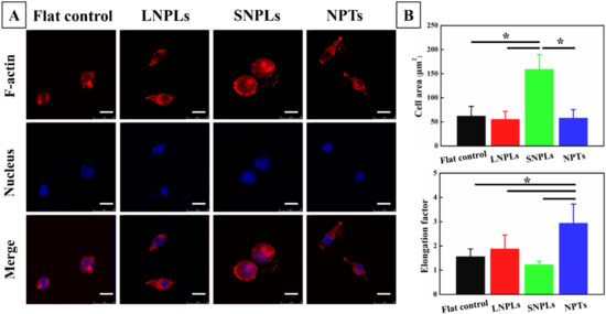 Fluorescence microscopy images (Figure 3A) were in agreement with SEM observations of macrophage adaptation to the different nanotopographies. In addition, the absence of organized actin stress fibers was observed for the macrophages, which was consistent with previously reported observations. Instead, the cells exhibited diffuse actin staining with some clustering, particularly around their periphery. A quantitative analysis of cell morphology changes (Figure 3B) was performed by calculating the projected spreading area of the RAW264.7 cells on each sample and their elongation factor. The spreading cell area remained constant for the macrophage grown on the flat control, LNPL and NPT substrates. SNPLs promoted a statistically significant increase in spreading cell area. Concerning the elongation factor, the value is high when cell shape is elongated and decreases when the cell becomes more polygonal. Cells on the NPTs substrate showed a considerably higher degree of elongation compared with cells on the other three substrates. Macrophages on the SNPLs had the lowest degree of elongation.