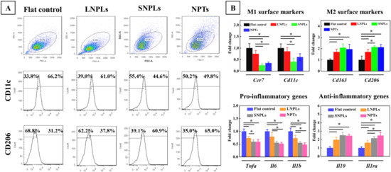 To investigate whether cell shape may have a direct effect on macrophage polarization status, we employed flow cytometry to calculate the percentage of M1 and M2 cells on different substrates by measuring the level of the surface markers CD11c and CD206, respectively. As shown in Figure 4A, a decreased percentage of M1-type macrophages expressing CD11c was found for the SNPLs (44.6%) and NPTs (49.8%) compared with the flat control (66.2%) and LNPLs (61.0%). In addition, the percentage of CD206-positive cells increased from 31.2% for the flat control to 37.8%, 60.9% and 65.0% for the LNPLs, SNPLs and NPTs, respectively.