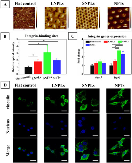 Stable focal adhesion requires integrin clustering and stability of the binding between the two (integrin cluster size), and it also involves the stabilization of the cytoplasmic side with reinforcement of adhesion proteins, including vinculin, paxillin, talin and focal adhesion kinase [39]. In this work, we employed vinculin as a marker of focal adhesion considering that it is recruited at the adhesion site via integrin β1 receptor. The localization of vinculin was probed via immune-fluorescence microscopy (Figure 5D). Relatively smaller focal adhesions were observed on the flat control surface. For LNPLs, focal adhesions were localized regularly along the cell periphery, while cells on SNPLs formed adhesion contact not only at cell periphery but also within the lamellipodium leading edge. Focal adhesion on NPTs were distributed predominantly to the cell periphery; meanwhile, they were observed to be involved in cell protrusions.