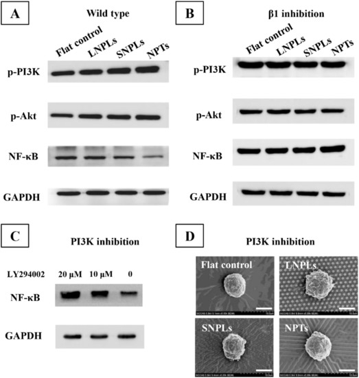 NF-κB plays a vital role in the innate immune response [40,41]. As shown in Figure 6A, enhanced levels of NF-κB protein were measured on the LNPLs and flat substrates when compared with the SNPLs and NPTs. This was consistent with the results of macrophage polarization status on the substrates. NF-κB subunits have sites for phosphorylation and other post-translational modification which are vital for crosstalk with other signaling pathways. The crosstalk can occur through various kinases, including glycogen synthase kinase and Akt triggered by phosphoinositide 3-kinase (PI3K), which regulate NF-κB transcriptional activity [42]. In this work, the phosphorylation levels of PI3K and Akt on the SNPLs and NPTs substrates were higher than those of the LNPLs and flat substrates. Similar results were observed by Zhao et al. that PI3K/Akt pathway negatively regulated NF-κB pathway and the expression of inflammatory genes [43]. As shown in Figure 6B, the phosphorylation of PI3K/Akt was inhibited after β1-specific knockdown, which indicated that β1 integrin was implicated in PI3K/Akt pathway activation.