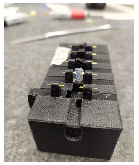 The specimens were placed in a sample holder (Figure 3), which was placed between two gold electrodes. The setup was calibrated using the short/open method—the fixed distance between the electrodes guaranteed a good reproducibility of the measurements. The gold electrodes were connected to the instrument with Kelvin clamps (fixing the geometry of the cables), and then the short/open measurements were collected. Finally, the electrical measurements of the samples were carried out. The electrical measurements were used to obtain the lumped circuit, as reported in the literature [51,52].