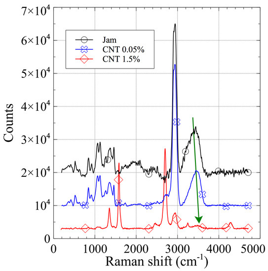 The pure jam and 0.05% CNT specimens show the same Raman pattern, even if the low-intensity peaks characteristic of CNTs are visible. The 1.5% CNT specimen has a spectral pattern completely different from the others, showing mainly the characteristic bands of nanocarbon compounds: a D band around 1350 cm−1, a G band around 1580 cm−1, a 2D band around 2700 cm−1, and a peak around 4300 cm−1 related to the presence of nanocarbon. In all of the spectra, the peak related to water, at around 3400 cm−1, exhibits a slight red shift, increasing the CNT content.