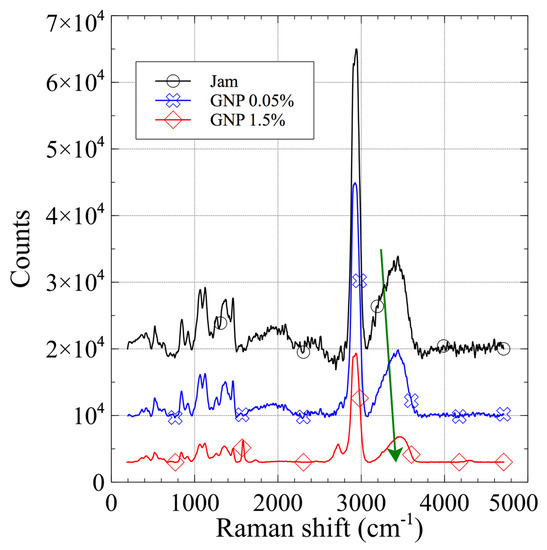 In the case of jam loaded with GNPs, the Raman spectrum results of pure jam were not modified by the loading of nanocarbon. The 1.5% GNP specimen’s spectrum presents marked bands of nanocarbon compounds: a G band around 1580 cm−1, and a 2D band around 2700 cm−1. These data also show a red shift of the water peak with increasing GNP content. The common behavior of the CNT and GNP specimens suggests the same effect of nanocarbon inside the jam matrix—during the gelling process, the presence of sugar is fundamental to reduce the activity of water and to stabilize junction zones by promoting hydrophobic interactions [21]. The nanocarbon, having a hydrophobic nature, could help the stabilization via hydrophobic interaction; consequently, the structure becomes more compact and the hydrogen bonds become stronger, as suggested by the red shift [53].