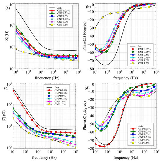The graphs in Figure 6a,b, show the amplitude and phase of the measured impedance (Z) of the CNT/jam nanocomposites.