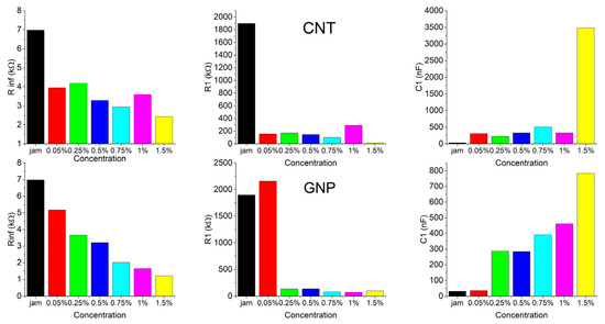 Figure 8. Best fitting results of R, R1, and C1 for CNT (top) and GNP (bottom) jam nanocomposites.