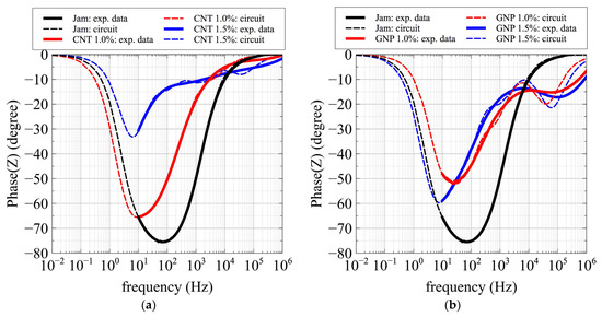In the simulated curves for the CNT composites (Figure 9a), the dashed lines reproduce the phase curve perfectly, enabling determination of the resonant frequency for the 1 and 1.5% CNT samples, and confirming the resonant peak for the jam specimen.
