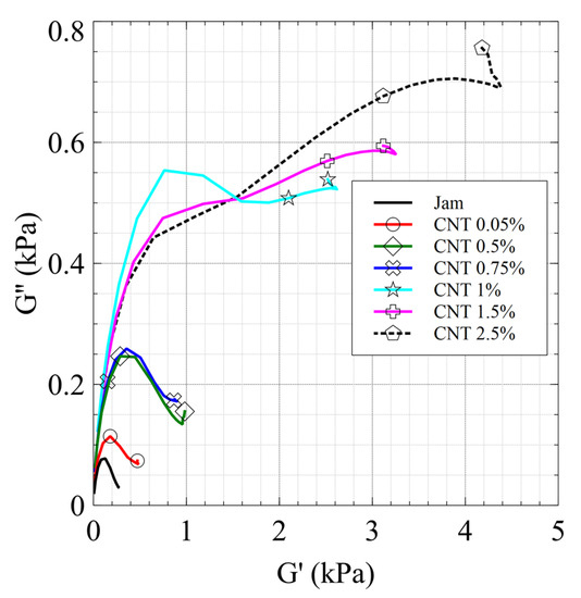 The graph reported in Figure 10 shows the trend of the storage modulus (G’) and the loss modulus (G”) as a function of shear strain of the jam–CNT nanocomposites. According to ISO 6721-10, we calculated the limit of the linear viscoelastic (LVE) region when a difference of 5% in G’ values occurred. The LVE region decreased gradually with increasing filler content. Since the LVE region is the limit at which elastic deformation occurs, we would argue that the presence of CNTs reduces the LVE region, because the movement of the matrix around the fillers causes irreversible deformations, which are much larger the higher the filler concentration is [54].