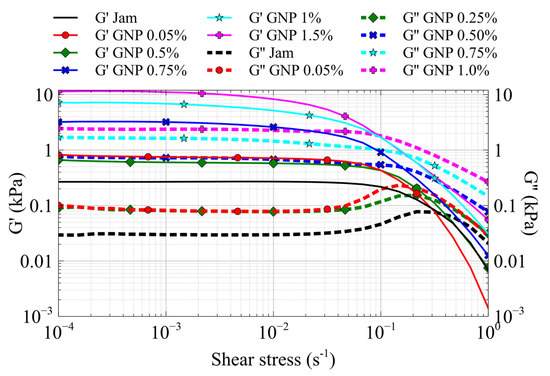 The graph reported in Figure 12 shows the trend of G’ and G” as a function of the shear strain of the jam–GNP nanocomposites.