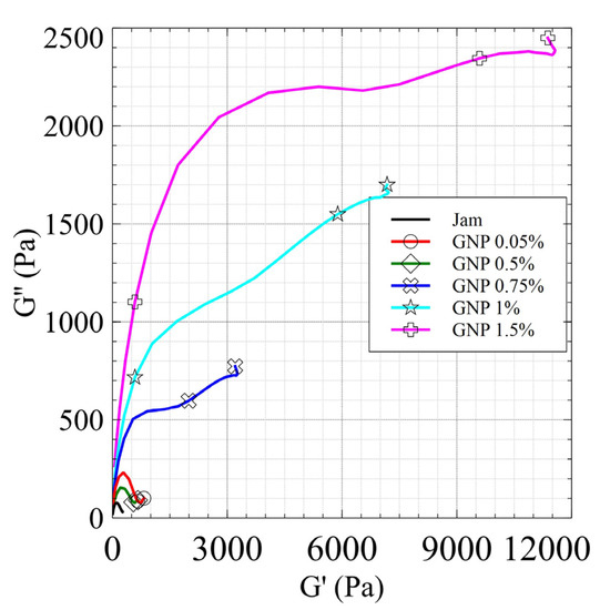 Thus, the rheological percolation threshold for GNP/jam specimens was estimated between 0.5 and 0.8%—lower than the electrical percolation threshold.