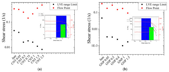 Figure 14. LVE range limits (black squares) and flow points (red dots) vs. concentration for (a) CNT/jam nanocomposites and (b) GNP/jam nanocomposites. In the insets, the representation of the yield zones (inset) for jam (green area) and the 2.5% nanocomposite (blue area) is reported. The black dotted and red dotted curves are the G’ and G” of pure jam and (a) CNT 2.5% and (b) GNP 1.5%, as reported in Figure 10 and Figure 12, respectively.