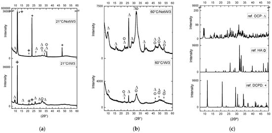 XRD analysis results for (a) process 1 (21 °C/W/3) and 2 (21 °C/NotW/3) (b) process 3 (60 °C/W/3) and 4 (60 °C/NotW/3) obtained after 3 min reaction and (c) the reference powder patterns from Inorganic Crystal Structure Database (ICSD) for DCPD (PDF no: 00-009-0077), HA (PDF no: 00-064-0738) and OCP (PDF no: 04-013-3883) that are provided for comparison. The peaks in (a,b) are marked as Δ, + and O which matches respectively with the peaks at the ref. OCP, ref. DCPD and ref. HA/ nanocrystalline apatite/. Some peaks overlap in both OCP and HA. The high intensity in the starting point of the graph in 2 θ: 7° is due to the device not being suitable for low angle measurements and considered as error.