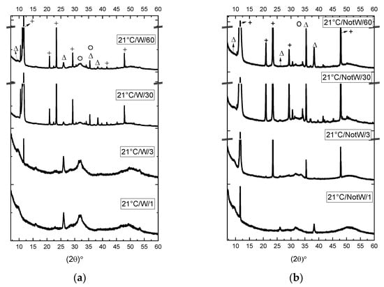 According to Figure 2a, 21°C/W/1–60, the dominating peak in the sample with 1 min reaction, is a broad peak around 30–35, that peak together with 3 other broad peaks between 45–55, matches the pattern reported for nanocrystalline apatite []. The mentioned peak exists even after 60 min; however, DCPD is created in the sample with 3 min reaction and is the dominating peak for samples with 3 min and longer reaction time. This shows that nanocrystalline apatite is created at the beginning of the reaction and stays in the sample even after 60 min; however, it is not the dominating peak even 3 min after the reaction.