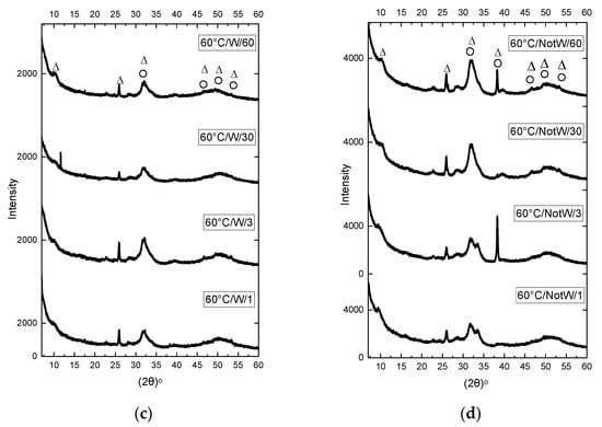 Comparing the W and NotW samples made at RT with 1 min reaction, respectively 21 °C/W/1 in Figure 2a and 21°/NotW/1 in Figure 2b, the mentioned peak at 11.6 that matches ref. DCPD in Figure 2c is observed in the NotW sample; however, it is not observed in the W sample. This may have a relation to the existence of residual ions in NotW samples; however, it can also be due to the washing step if the crystal size of DCPD is below the pore size of the filter 0.4 µm in 1 min reaction time. Observing the samples made at 60 °C, as shown in Figure 2c,d, OCP and nanocrystalline apatite co-exist in the XRD patterns. OCP with two peaks in 9.6° and 9.8° is the dominating peak for W samples, as shown in Figure 2c, and it does not have a significant change even after a 60 min reaction. In NotW samples, as shown in Figure 2d, the broad peak for nanocrystalline apatite is getting stronger with a longer reaction time.