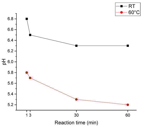 We observed that the pH value for the synthesis at 60 °C decreased by 0.6, whereas the pH value for the synthesis at RT decreased by about 0.4 in the first 60 min of the reaction. This indicates that in the case of the synthesis at 60 °C, reactions are favored where more protons are emitted into the solution during the reaction.