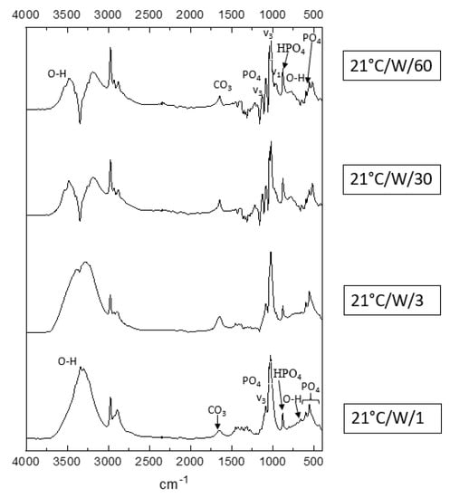 Comparing the spectra in Figure 4 to the FTIR spectra of DCPD, HA, OCP, and nanocrystalline apatite reported in [], in the region (500–1200 cm−1), the spectrum matches OCP and nanocrystalline apatite (with a peak at 877 cm−1 and two peaks at 500–550 cm−1) in 21 °C/W/1 and brushite is seen on 21 °C/W/3, 21 °C/W/30, and 21 °C/W/60. This result confirms the XRD results.