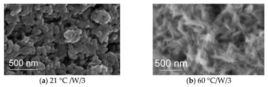 The SEM analysis was conducted to observe the morphology and the particle size. Figure 5 illustrates two SEM images that belong to W samples synthesized at RT and 60 °C for a 3 min reaction. Figure 6 shows the NotW samples made at RT and 60 °C for 3 min reaction. It is observed that all samples contain aggregated nanoparticles. The shape of particles for the sample 21°C/W/3 (Figure 5a) is circular and other samples 60 °C /W/3, 21 °C /NotW/3, and 60 °C /NotW/3 (respectively Figure 5b and Figure 6a,b) contain plate-like and rod-like morphology.