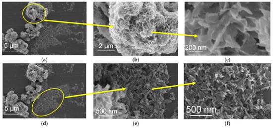 Figure 7 shows the SEM image of sample 21°C/W/1. Clusters are observed in the SEM image, where the mentioned clusters have different shapes and sizes; there are larger (1–5 µm) clusters, yellow-marked at Figure 7a, made of smaller (100–200 nm) plate-like or flake-like morphology, as shown in Figure 7c, and there are smaller size clusters, yellow marked at Figure 7d that are made of shorter Nano-rod type (100 nm long) clusters, as illustrated in Figure 7f. There are also thickness differences in the mentioned parts.