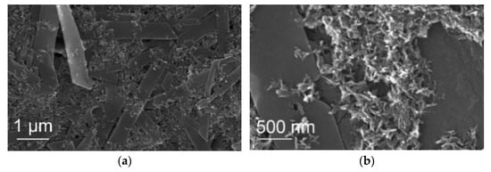 Figure 8 shows the SEM images of the sample 21 °C/NotW/3. It is observed that some flake-like crystals (approximately 1 µm wide) are created in 3 min that have not been observed in samples with a 1 min reaction. These crystals are observed together with smaller rod-like particles in the same area.