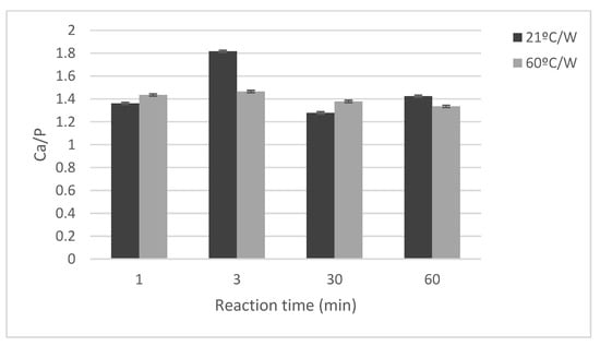 Figure 10 shows the changes in the Ca/P ratio of the particles prepared in the processes 1 (21 °C/W) and 3 (60 °C/W). For samples 60 °C/W, the Ca/P ratio has a slight increase between 1 and 3 min and a slow decrease until 60 min. However, for the sample (21 °C/W), the Ca/P ratio has changed significantly, it started around 1.35 (1 min), and increased to around 1.8 (3 min), and decreased to below 1.3 (30 min) and went back to around 1.45 (60 min). It might indicate an increase in precipitated calcium between 1 and 3 min or a decrease of phosphor and the opposite between 3 and 30 min. Whatever the reason, it is an indication of the transformation of the precipitate during this time.