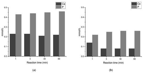 Figure 11 shows the changes of Ca and P concentration existing as ions in the rest solution. The mentioned ions are separated from the sample by centrifugation and analyzed in the rest solution after centrifuge. For the sample prepared at RT, as shown in Figure 11a, the Ca ion concentration starts at 0.23 mmol/L (1 min and 3 min), it slightly decreases to 0.21 mmol/L in 30 min reaction, and reaches 0.22 mmol/L after 60 min reaction. On the other hand, the P ion concentration starts at 0.43 mmol/L (1 min), and it slightly increases to 0.44 mmol/L after 3 min, 0.45 mmol after 30 min, until it reaches 0.46 mmol/L after 60 min reaction. It is observed that there are more P ions than Ca ions in the rest solution.