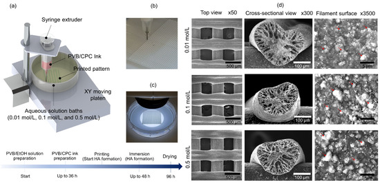 To fabricate 3D printed HA tunable scaffolds, we used PVB/CPC slurry composed of a liquid phase (PVB/EtOH solution) and a solid phase (a mixture of TTCP and DCPA) [1], which ejected through a 210 µm (27 gauge) nozzle into three concentrations of Na2HPO4 solutions (0.01 mol/L, 0.1 mol/L, and 0.5 mol/L) (Figure 1a–c). SEM images from the top view, the cross-sectional view, and the filament surface of the 3D printed scaffolds demonstrated the existence of the mineral phase (Figure 1d).