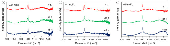 Although SEM images demonstrated the presence of mineral phase in the scaffolds, they are limited to identifying the presence and crystal structure of HA. To this end, we performed Raman spectroscopy to capture the real-time in situ HA formation and TTCP reaction in the presence of 0.01 mol/L, 0.1 mol/L, and 0.5 mol/L Na2HPO4. The spectral of each material was measured as shown in Figure S1. Based on these spectral data of each material, we found that the peak centered at 960 cm−1 indicates the HA formation, and the peak centered at 940 cm−1 shows the presence of TTCP material (Figure S1). The TTCP peak was maintained at 940 cm−1 in the 3D printed scaffolds immersed in 0.01 mol/L aqueous solution for 48 h (Figure 2a). However, scaffolds immersed in 0.1 mol/L aqueous solutions and 0.5 mol/L aqueous solutions demonstrated a reduction in intensity at 940 cm−1 after 24 h. In addition, Raman intensity at 960 cm−1 was increased for both scaffolds formed in 0.1 mol/L and 0.5 mol/L aqueous solutions (Figure 2b,c). After 48 h soaking, the scaffolds using 0.1 mol/L and 0.5 mol/L solutions showed a similar spectral shape to commercially available HA c and Figure S1). Based on the measurement results, it is noted that the concentration of Na2HPO4 solution affected the speed of chemical reaction for HA formation.