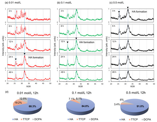Effect of the printing environment on HA formation in 3D printed scaffolds. X-ray diffraction (XRD) scan of the 3D printed scaffolds embedded up to 48 h in (a) 0.01 mol/L Na2HPO4 solution; (b) 0.1 mol/L Na2HPO4 solution; (c) 0.5 mol/L of Na2HPO4 solution; (d) Representative data for 3D printed scaffold composition (in percent volume fraction) at 12 h time point by using whole powder pattern fitting (WPPF) method; n = 3 individual experiments.