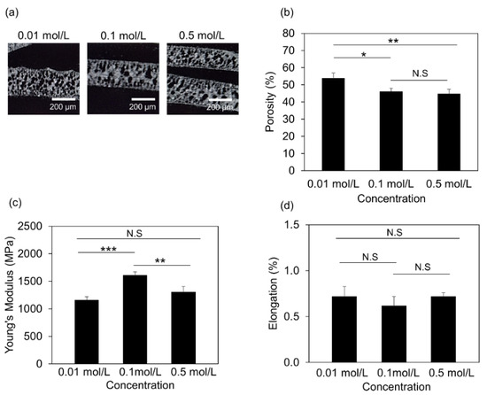 Microstructural analysis of 3D printed scaffolds: (a) Representative μCT images of the filaments with using different concentrations of the aqueous solution (Scale Bar = 200 μm); (b) calculated porosity (%) of the 3D printed filaments; (c) Young’s modulus; and (d) elongation under 0.01 mol/L, 0.1 mol/L, and 0.5 mol/L Na2HPO4 conditions. Data expressed as mean ± S.E.M.; * p-value < 0.05; ** p-value < 0.01; *** p-value < 0.005; N.S: non-significant; n = 5 for each experimental condition.