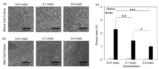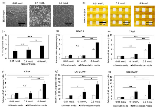 Finally, we examined the osteoclast activity of those scaffolds by using RAW 264.7 cells which were differentiated into osteoclasts [34,35,36]. SEM imaging demonstrated the cell attachment and spread (Figure 5a), and live/dead assays showed the viability of the cells on those scaffolds after 48 h (Figure S4). Cells lied on scaffolds, prepared at a low concentration (0.01 mol/L aqueous solution), showed lower viability compared to the other conditions (Figure S4). Next, the cells were tested for their osteoclast differentiation potential by TRAP assay (Figure 5b). Interestingly, the cells on scaffolds, prepared in 0.5 mol/L aqueous solutions, showed a 2-fold increase in RAW differentiation potential, indicating that those scaffolds induce osteoclastogenesis (Figure 5c). In addition, we evaluated the gene regulation associated with osteoclast differentiation and activity. To this end, we examined the transcription levels of osteoclast-specific genes, such as Nuclear Factor of Activated T Cells 1 (NFATc1) (Figure 5d), Tartrate-Resistant Acid Phosphatase (TRAP) (Figure 5e), Cathepsin K (CTSK) (Figure 5f), Dendrocyte Expressed Seven Transmembrane Protein (DC-STAMP) (Figure 5g), and Osteoclast Stimulatory Transmembrane Protein (OC-STAMP) (Figure 5h). Specifically, the transcriptional levels of all the gene expressions are significantly higher for the scaffolds generated in 0.5 mol/L solutions than those in 0.01 mol/L solutions (Figure 5). Taken together, our results showed that HA formed under different solutions affected osteoclastogenesis. Finally, after 7d, we examined the resorption of those scaffolds by the differentiated osteoclasts. Specifically, the cells were removed from the surface area of the scaffolds, and SEM images demonstrated the formation of cavities (red arrows) on the surface of those scaffolds (Figure 6a,b). Interestingly, the scaffolds immersed in 0.01 mol/L aqueous solutions demonstrated more and larger voids than other concentrations of the aqueous solutions, and the overall porosity was 2-times higher than 0.5 mol/L aqueous solutions.
