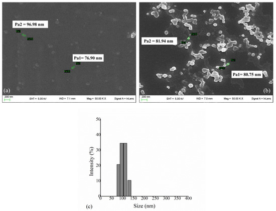 (a) SEM analysis of PLA NPs and (b) HexA-conjugated PLA NPs. The images were obtained with a magnification of 50,000× and show the characteristic sizes of some NPs. (c) DLS analysis of HexA-PLA NPs showing size distribution.