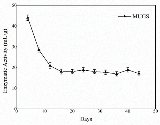 The activity of the immobilized HexA molecules was tested against the artificial substrate MUGS, which is specifically hydrolyzed only by this isoform of the enzyme, and the assay was repeated periodically under the same conditions in order to assess the stability over time of the enzyme-PLA NP system. The enzymatic assay was repeated on three different PLA NP preparations and the results are reported as mean values. The revelations were performed for more than forty days after the immobilization event and the mean results concerning the NP preparations are shown in Figure 2.