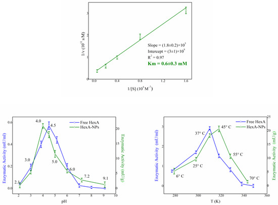 An accurate biochemical analysis was conducted to compare the function and stability of the HexA enzyme in its immobilized forms on PLA NPs relatively to its free form [35]. The Km value, pH, and temperature effects were tested at different times after immobilization and the mean values of the different measurements carried out are reported in Figure 3.