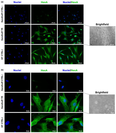 Representative fluorescence images of nuclei (DAPI, blue) and HexA (Alexa Fluor® 488, green) in untreated Sandhoff cells (CTRL−), HexA-NP treated Sandhoff cells (TR), and healthy human fibroblast (HF) cells (CTRL+) at an objective magnification of 20× (panel (a)), and of 60× (panel (b)). On the right side of the panels, brightfield images of HexA-NP treated Sandhoff cells (TR) are shown at magnification 20× (panel (a)) and 60× (panel (b)).